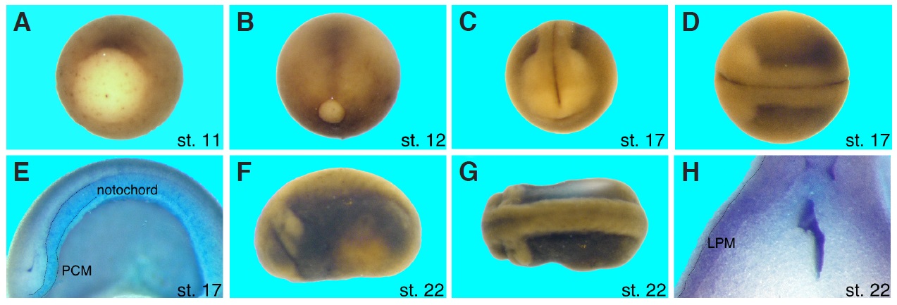 Larger Image Fig. 4. The ADHFe1 protein localizes to the dorsal midline and the lateral plate mesoderm. The ADHFe1 protein was localized in embryos from various stages utilizing the anti-ADHFe1 antibody. (A) Mid gastrula (stage 11), vegetal view. (B) Late gastrula (stage 12), vegetal view. (C) Late neural fold stage (stage 17), rostral view. (D) Stage 17, dorsal view. (E) Sagital bisected embryo, stage 17. (F) Stage 22, lateral view. (G) Stage 22, dorsal view. (H) Detail of cross section of stage 22 bisected embryo. Image published in: Shabtai Y et al. (2017) Copyright © 2017. Image reproduced with permission of the Publisher, University of the Basque Country Press.