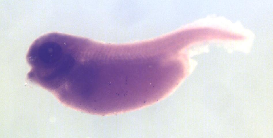 Larger Image srebf1 (sterol regulatory element binding transcription factor 1 L homeolog) gene expression in X. laevis embryo, assayed via in situ hybridization, NF stage 35/36, lateral view, anterior left, dorsal up. Copyright © Perron Lab