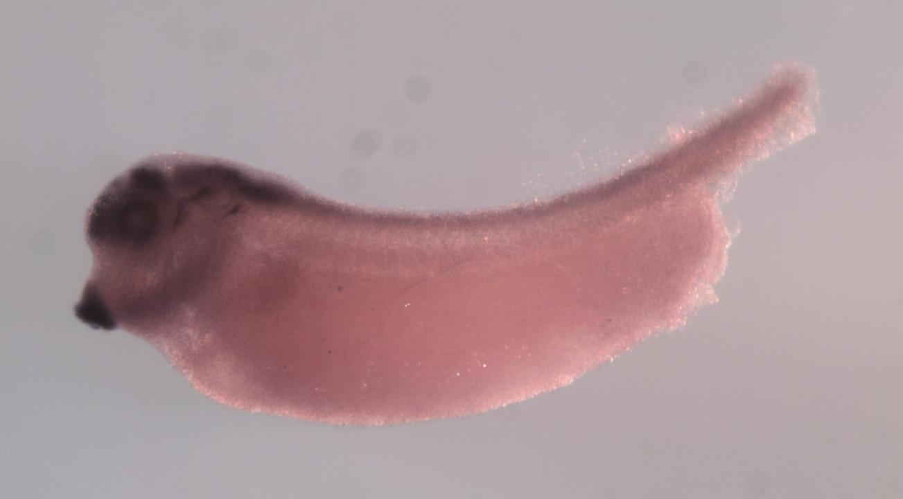 Larger Image mmp24 (matrix metallopeptidase 24) gene expression in X. laevis embryo, assayed via in situ hybridization, NF stage 35 & 36, lateral view, anterior left, dorsal up. Copyright © Perron Lab