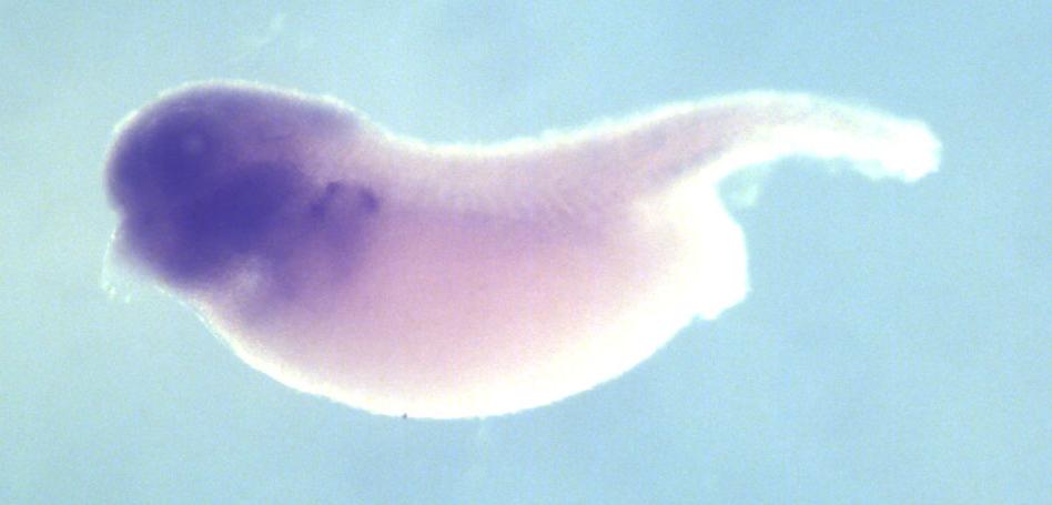 Larger Image lamb2 (laminin subunit beta 2 L homeolog) gene expression in X. laevis embryo, assayed via in situ hybridization, NF stage 35 & 36, lateral view, anterior left, dorsal up. Copyright © Perron Lab