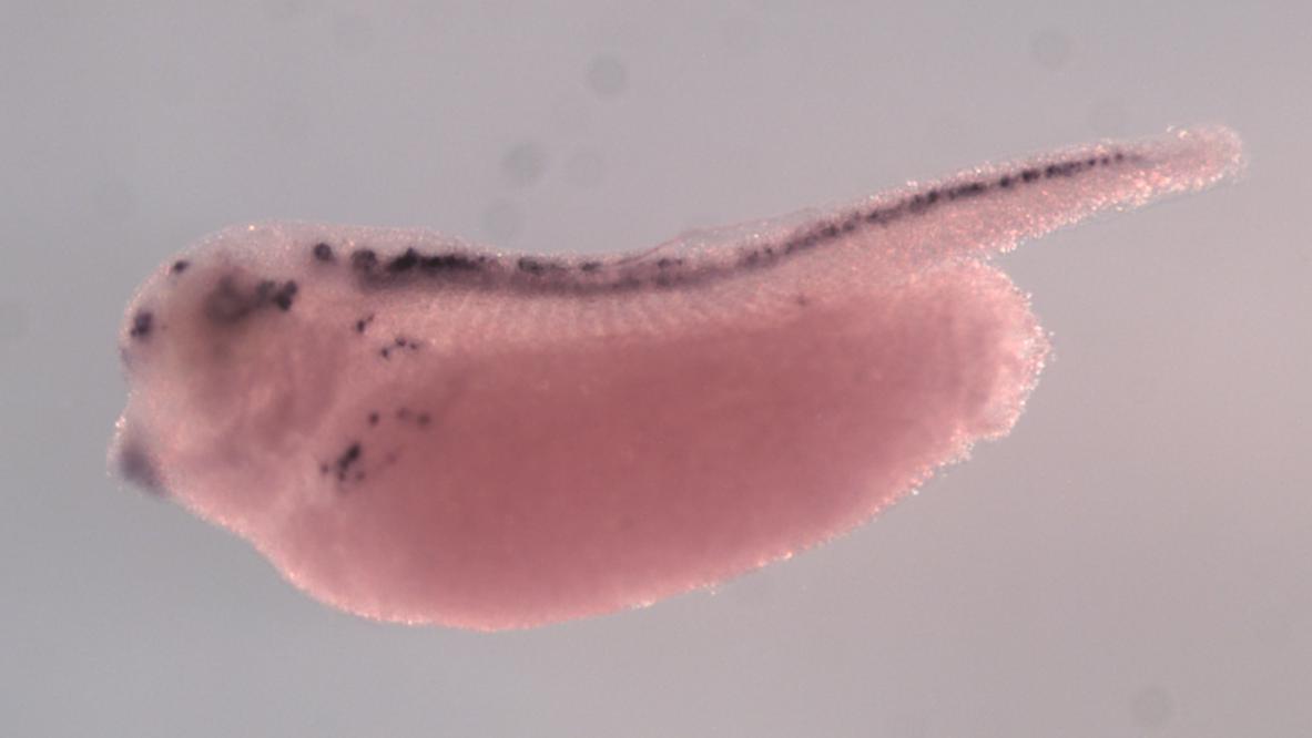 Larger Image aifm3 (AIF family member 3) gene expression in X. laevis embryo, assayed via in situ hybridization, NF stage 33 & 34, lateral view, anterior left, dorsal up. Copyright © Perron Lab