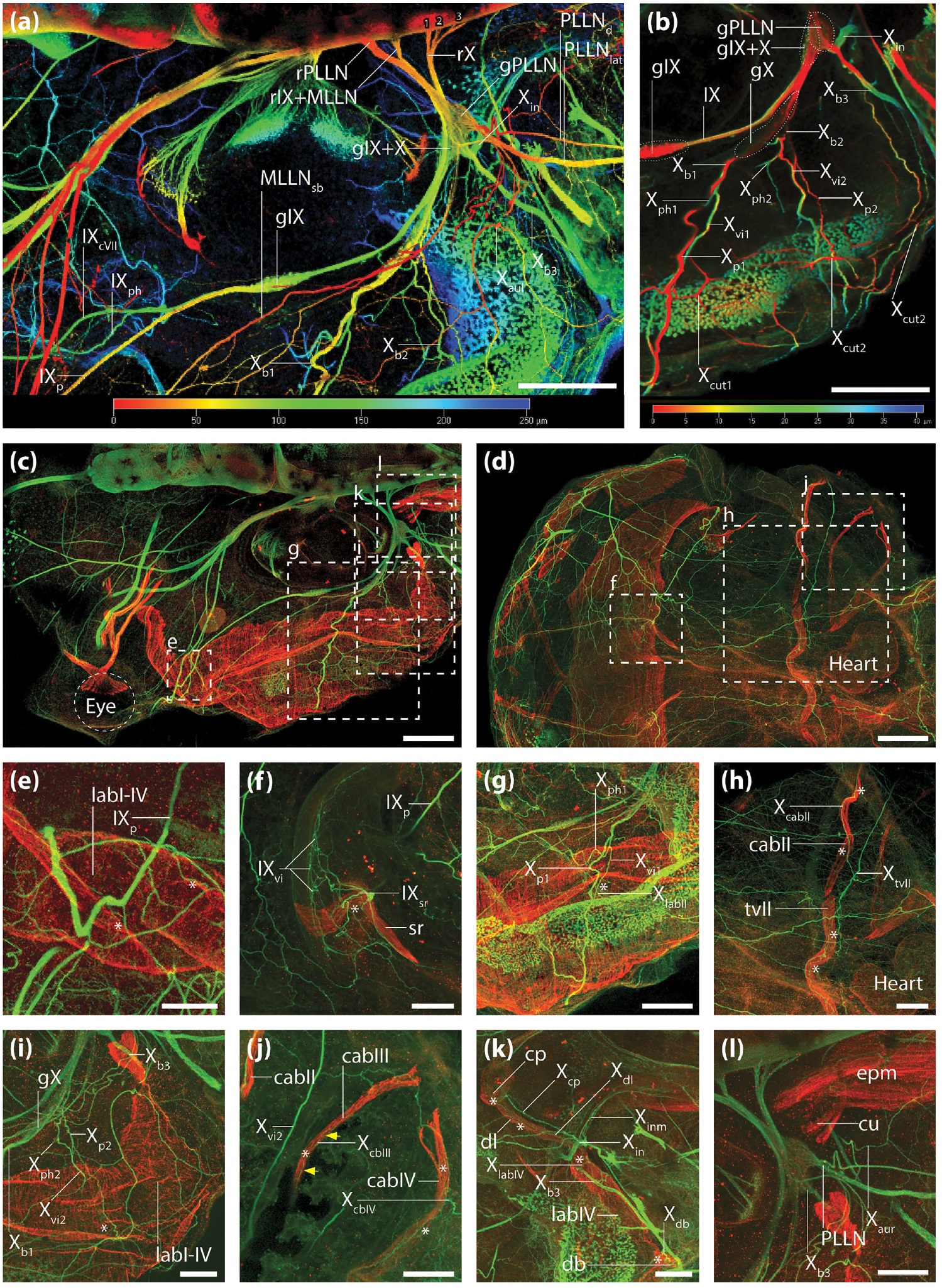 Larger Image FIGURE 8 The glossopharyngeal and vagal nerves. Whole mount antibody staining of the nerves (anti-acetylated alpha-tubulin) and muscles (anti-desmin) of a NF stage 47/48 X. laevis tadpole. (a and b) 3D depth coding views of the nerves. (a) dorsal view of the region of the otic capsule. (b) dorsal view of the distal branchial region. (câl) maximum intensity projections of the same digital stack. Nerves are shown in green, muscles are shown in red. (c) dorsal overview of head and branchial region. (d) ventral overview of the head and branchial region. (eâl) magnifications of the areas marked by the strippled rectangles in (c) and (d). The white asterisks indicate the innervation sites of the branchial muscles by rami/ramuli of the glossopharyngeal (IX) and vagal nerves (X). The yellow arrows indicate the route of the ramulus constrictor arcus branchiarium III of the X. (l) dorsal view of the cucullaris muscle. The white scale bar in (c) and (d) is 200 mm, in (e) to (l)50 mm [Color figure can be viewed at wileyonlinelibrary.com] Image published in: Naumann B and Olsson L (2018) Copyright © 2018. Image reproduced with permission of the Publisher, John Wiley & Sons.
