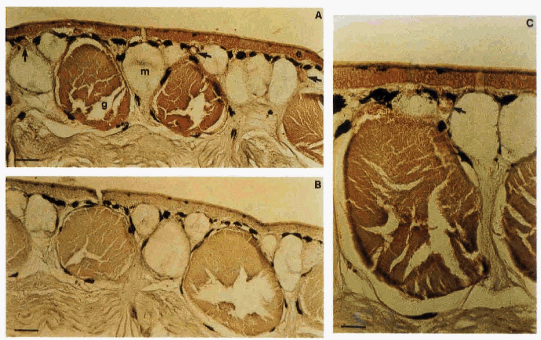 Larger Image FIG. 5. Immunohistochemical analysis of X. luevis skin. A and C, positive staining (brown) of the epidermis (e), granular glands (g), and regenerating granular glands (arrows) with antiserum SKP-2. Mucous glands (m) show no immunoreactivity. B, no signals were obtained after stainiig with the preimmune serum. Sc& bars are 100 pm (A and B) and 50 pm (C). Image published in: Hauser F et al. (1992) Copyright © 1992. Image reproduced with permission of the Publisher.