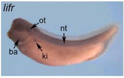 Larger Image lifr (LIF receptor subunit alpha) gene expression in Xenopus laevis embryo, assayed via in situ hybridization, NF stage 35-38, lateral view, anterior left, dorsal up. This image is extracted from figure published in: Jalvy S et al. (2019) Copyright © 2019. Image reproduced with permission of the Publisher, Elsevier B. V.