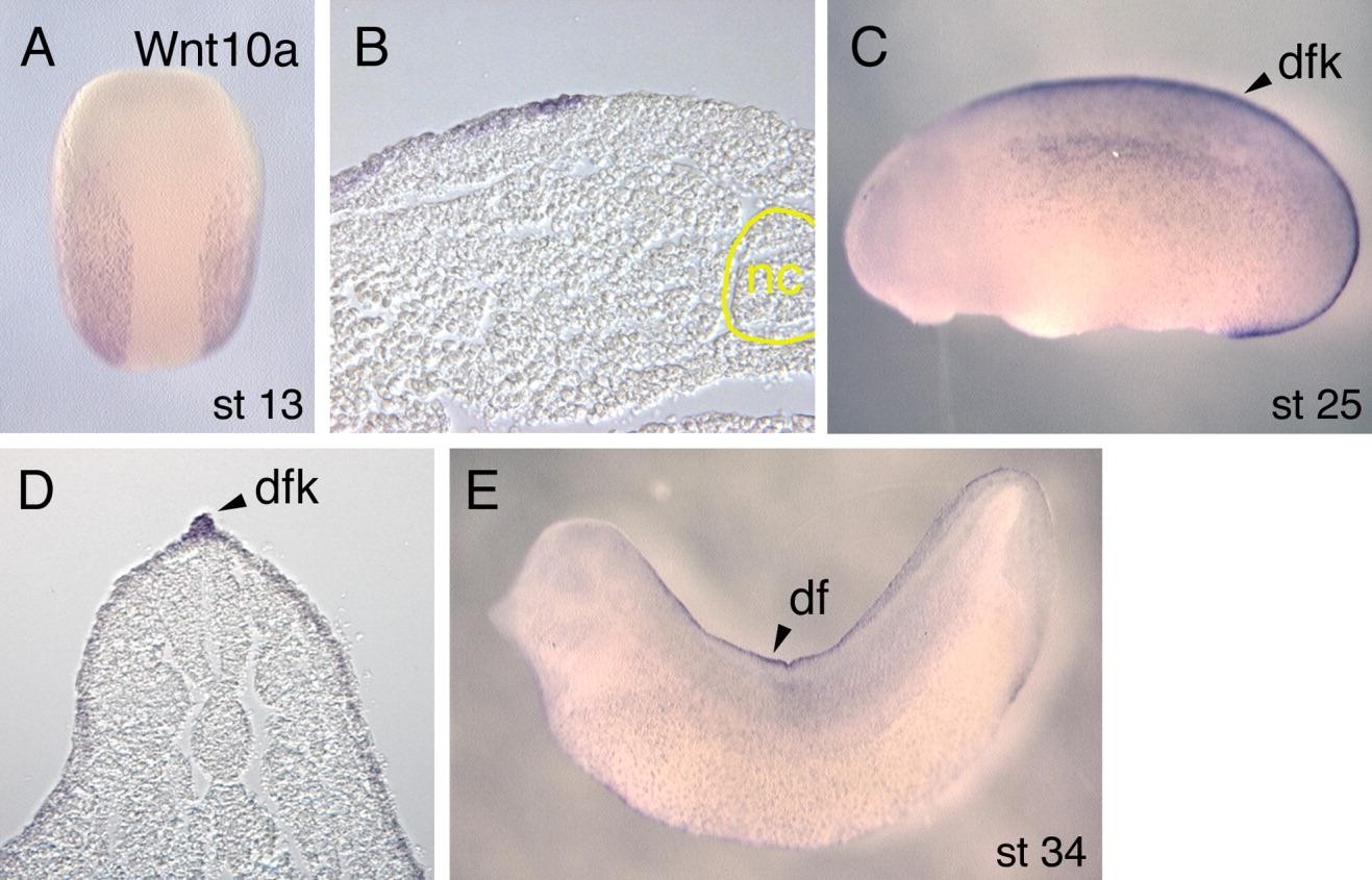 Larger Image Figure 5. In situ hybridization analysis of Wnt10a during Xenopus development. A: Dorsal view of stage 13 embryo showing expression of Wnt10a in the trunk ectoderm of the embryo but not within the neural plate. B: Transverse section through embryo in A showing staining of Wnt10a in the endodermal cells just lateral to the neural plate. For reference, the notochord (nc) is outlined in yellow. C: Lateral view of a stage 25 embryo showing expression of Wnt10a in the ectoderm and dorsal fin keel (dfk). D: Transverse section through the trunk region of a stage 25 embryo showing staining of Wnt10a in the ectodermal cells of the dorsal fin keel. E: Lateral view of a stage 34 embryo showing expression of Wnt10a in the lateral ectoderm and persisting in the ectoderm tissue of the dorsal fin (df). GenBank accession number for Xenopus laevis Wnt10a is DQ658155. Image published in: Garriock RJ et al. (2007) Copyright © 2007. Image reproduced with permission of the Publisher, John Wiley & Sons.