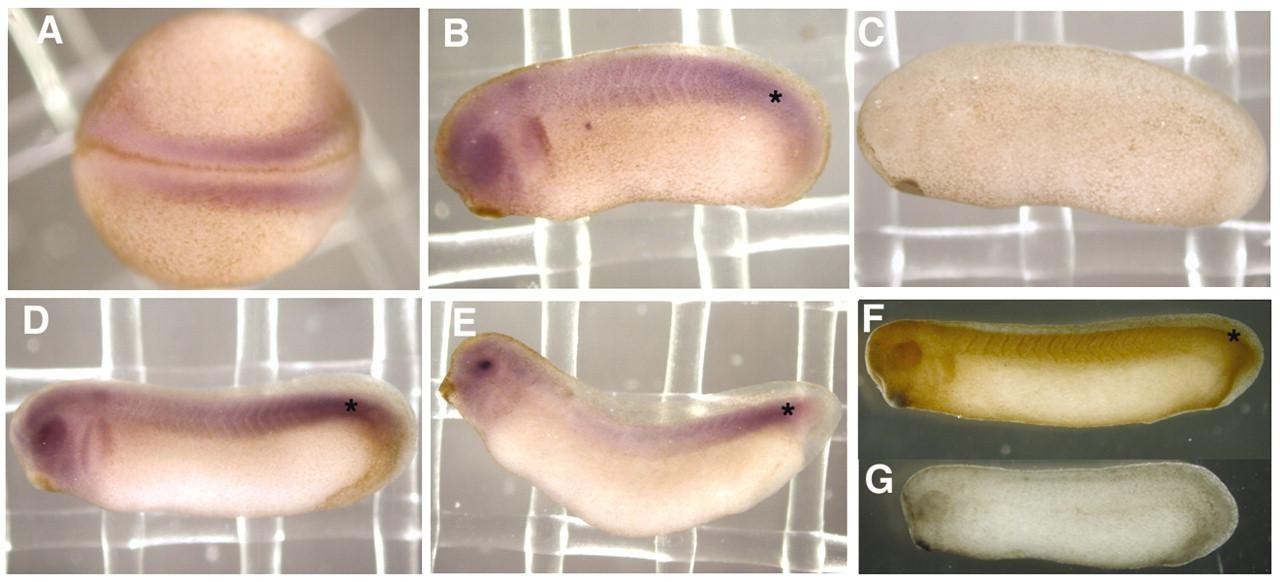 Fig. 1. Expression pattern of EDEN-BP during Xenopus early development. Embryos were collected at different stages: neurula, stage 18 (A); tailbud, stage 25 (B,C,G) and stage 27 (D,F); tadpole, stage 31 (E). (A) Dorsal view, (B-G) lateral views; anterior left. Embryos were processed for whole-mount in situ hybridization using an EDEN-BP antisense (A,B,D,E), or sense (C) probe, or for whole-mount immunohistochemistry using an anti-EDEN-BP antiserum (F), or the corresponding pre-immune serum (G). The asterisks in B, D, E and F highlight the higher amount of EDEN-BP mRNA or protein in the presomitic mesoderm.
