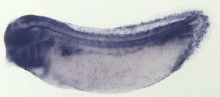 Larger Image foxf1 (forkhead box F1 ) gene expression in Xenopus tropicalis embryo, assayed via in situ hybridization, NF stage 32, lateral view, anterior left, dorsal up. Copyright © Harland Lab Image published in: Harland