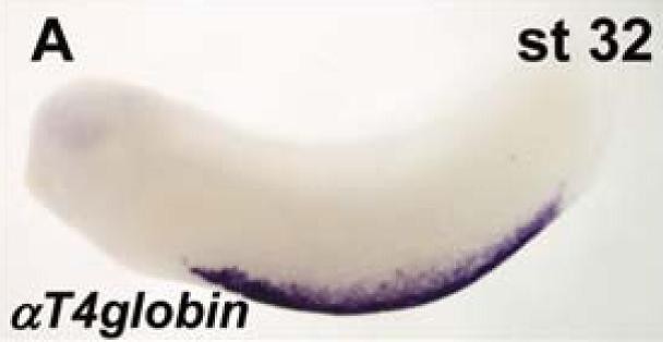 Larger Image hba4 (alpha-T4 globin) gene expression in Xenopus laevis embryo, assayed via in situ hybridization, NF stage 32, lateral view, anterior left, dorsal up. This image is extracted from figure published in: Liu F et al. (2008), Image published in: Liu F et al. (2008) Copyright © 2008. Image reproduced with permission of the Publisher, Elsevier B. V.
