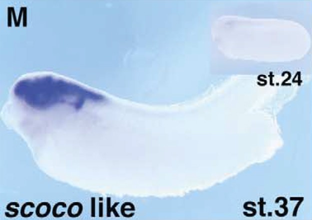 Larger Image scoc (short coiled-coil protein) gene expression in Xenopus laevis embryos, NF stage 37 (stage 24 inset), as assayed by in situ hybridization, lateral view, anterior left, dorsal up. This image is extracted from figure published in: Tessmar K et al. (2002), Image published in: Tessmar K et al. (2002) Copyright © 2002. Image reproduced with permission of the Publisher, Elsevier B. V.