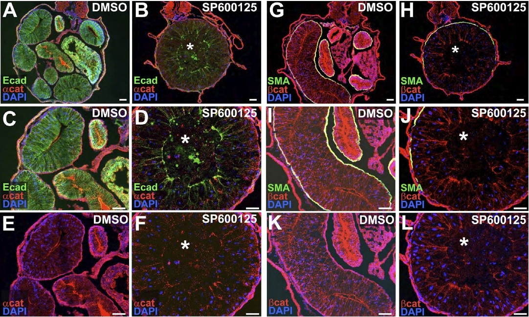 | Larger Image Fig. S1. JNK is required for the localization of adherens junction components during Xenopus gut morphogenesis. (A-L) Embryos were exposed to DMSO or SP600125 from stages 35 to 46, fixed, sectioned and immunohistochemically processed to reveal E-cadherin (Ecad, green; A-D), the adherens junction components α-catenin (αcat, red; A-F) and β-catenin (βcat, red; G-L), the gut mesodermal marker, smooth-muscle actin (green, as a counterstain; G-J) and DAPI-stained nuclei (blue) in the developing gut tube, as indicated. Asterisks indicate the inner population of endoderm cells. Scale bars: 50 μm. Image published in: Dush MK and Nascone-Yoder NM (2013) Copyright © 2013. Image reproduced with permission of the Publisher and the copyright holder. This is an Open Access article distributed under the terms of the Creative Commons Attribution License. Permanent Image Page Printer Friendly View XB-IMG-80524 |