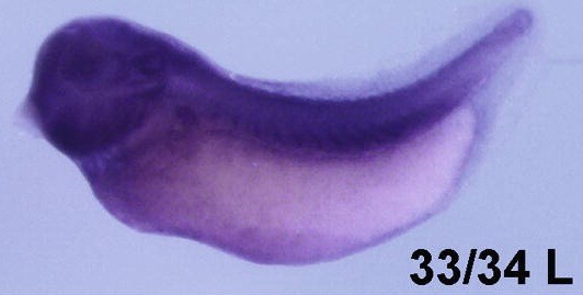 Larger Image wdr73 (WD repeat domain 73) gene expression in Xenopus tropicalis embryo, assayed via in situ hybridization, NF stage 33 &34, lateral view, anterior left, dorsal up. Image published in: Kyuno J et al. (2008) Copyright © 2008. Image reproduced with permission of the Publisher, Elsevier B. V.