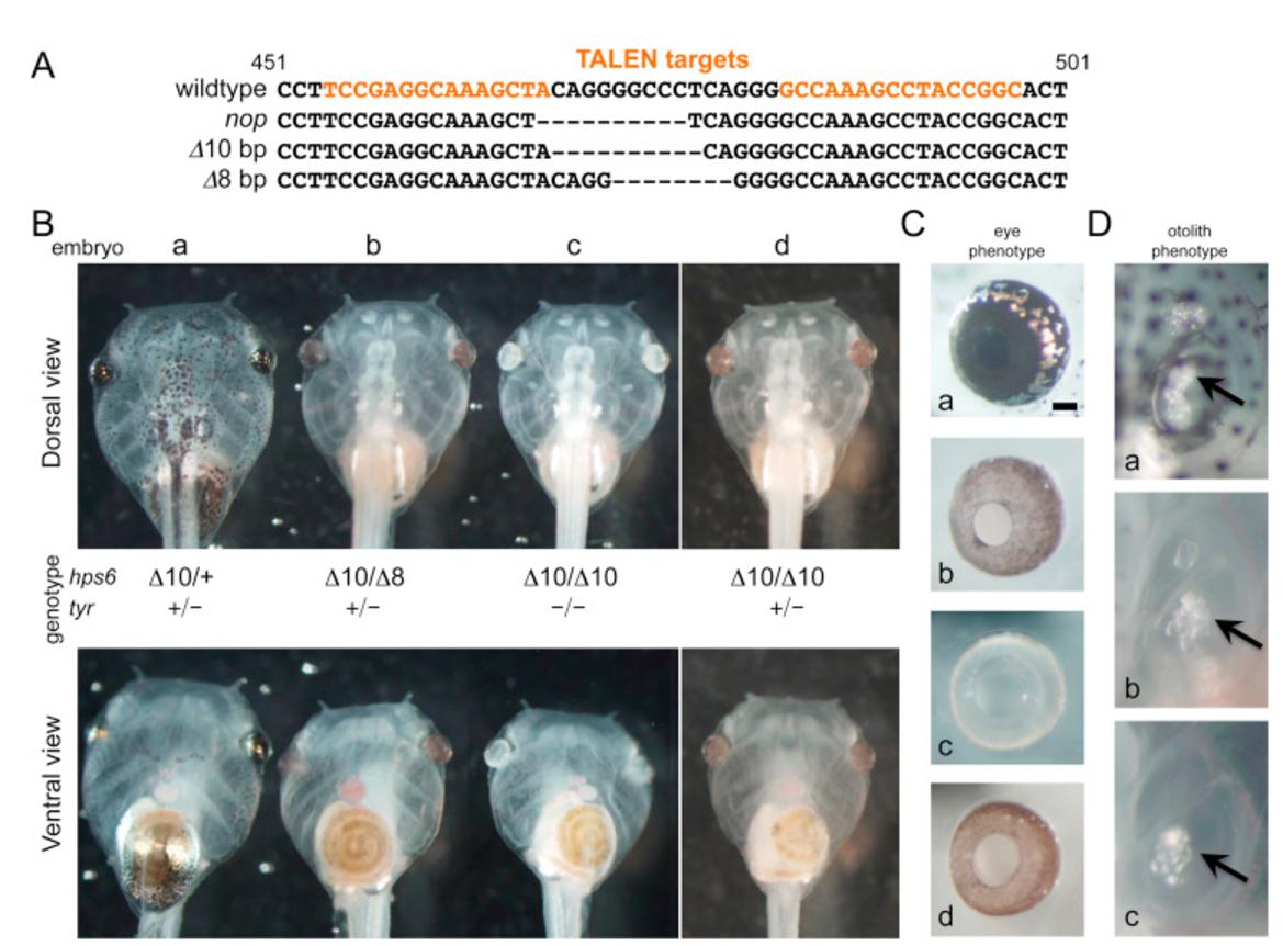Anatomical Phenotypes: abnormal eye morphology, abnormal inner ear morphology, abnormal intestine morphology, absent iridophore, decreased pigmentation in the epidermis, decreased pigmentation in the eye, decreased pigmentation in the whole organism, decreased size of the eye