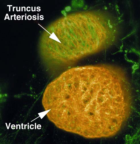 Atlas: tissues: heart: Stage 46: cardiac troponin T (red) and fibrillin (green)
