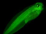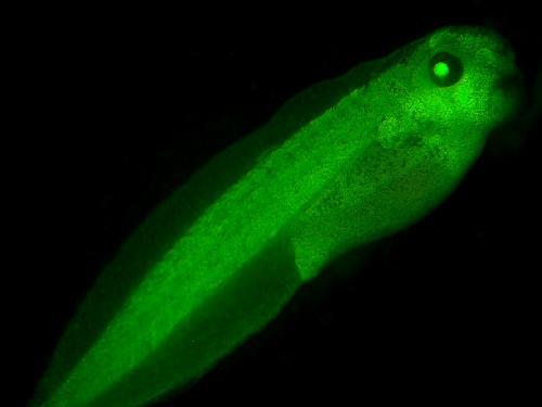 Green GFP fluorescence in Xla.Tg(eef1a1:GFP;cryga:GFP)Krieg tadpole