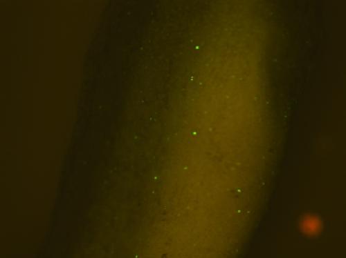 Tubulin promoter driving expression of deup1 fused to eGFP labeling both deuterosomes and centrioles specifically in multi-ciliated cells. Custom transgenic generated by the NXR for Brian Mitchell |