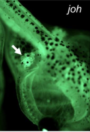 Intense GFP expression in the pronephric kidney (white arrow) of the jovan heat, (joh) tadpole, NF stage 48.