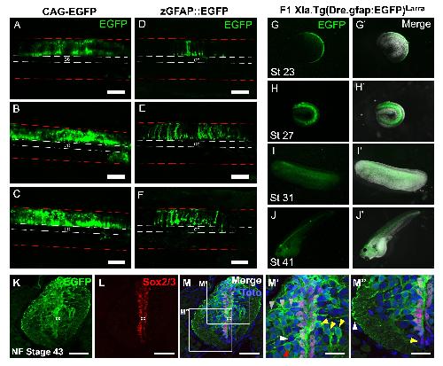 Figure S4. Transgenic line Xla.Tg(Dre.gfap:EGFP)Larra. (A-C) Three different animals’ electroporated in the spinal cord with the CAG promoter driving the expression of EGFP in central canal cells. (D-F) Three different animals electroporated in the spinal cord with the zGFAP::EGFP construct driving specific expression in radial glial like cells in contact with the central canal. (G-J) Animals at different developmental stages of the transgenic line Xla.Tg(Dre.gfap:EGFP)Larra show in expression of EGFP in the neural tubeg at (G-G’) NF stage 23; (H-H′) NF stage 27; (I-I′) NF stage 31 and in the CNS at (J-J’) NF stage 41. (K-M) Double staining against (K) EGFP and (L) Sox2 in coronal section of the spinal cord at NF stage 43. Panels (M) showed merge image, and panels (M’, M”) are magnifications of the dorsal and ventral cells surrounding the central canal.