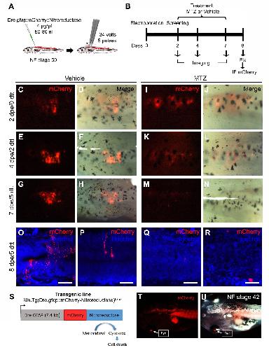 Figure S7. Transgenic line Xla.Tg(Dre.gfap:mCherry-Nitroreductase) allows selective cell ablation. (A) Diagram of injection and electroporation of the spinal cord at NF stage 50, indicating volume, concentration and parameters of electroporation. (B) Scheme of electroporation of the Dre.gfap:mCherry-Nitroreductase construct and treatment with vehicle or metronidazol (MTZ) at NF stage 50. (C-R) mCherry (red) expression in the spinal cord of animal electroporated at (C-D; I-J) 2 days post electroporation (dpe), before treatment; (E-F; K-L) 4 dpe and 2 days post treatment (dtt); (G-H; M-N) 7 dpe and 5 dtt, and (O- R) at 8 dpe and 6 dtt co-stained with Hoechst (blue). (S) The construct used to generate the transgenic line Xla.Tg(Dre.gfap:mCherry-Nitroreductase). (T, U) mCherry expression in the eye (arrow) and the brain of the transgenic animal at NF stage 42.