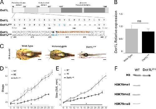 Fig. 1. Dot1L18 mutants show a complete loss of H3K79 methylation. A Schematic representation of the Dot1L18 mutation located in the methyltransferase domain of Dot1L. BThe expression of Dot1L mRNA is not affected by the mutation. Relative expression of Dot1L in wild type (WT) and Dot1L18 tadpoles at stage 48 was measured by qRT-PCR, normalized to that of eIF. Note that no significant difference in Dot1L transcript levels was observed between the two genotypes. C Phenotypic observation at 28 days post-fertilization in WT, heterozygous (HE), and homozygous (Dot1L18) Dot1L18 animals. Twenty animals per genotype were housed individually after genotyping and photographed every 2 days, from day 6 to day 30 to measure the developmental stage (D) or snout-to-Vent (SVL) size (E). Bars represent standard derivations, and stars indicate a significant difference between homozygous Dot1L18 (Dot1L18) and the other two genotypes based on pairwise t-test (p.value<0.05). F Western-blot analysis comparing H3 and methylated H3 in WT and Dot1L18 tadpoles at stage 48 by using antibodies against total H3, H3K79me1, H3K79me2, and H3K79me3. Note that no H3K79 methylation was detectable in Dot1L18 mutants