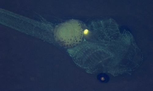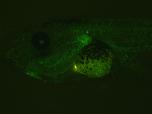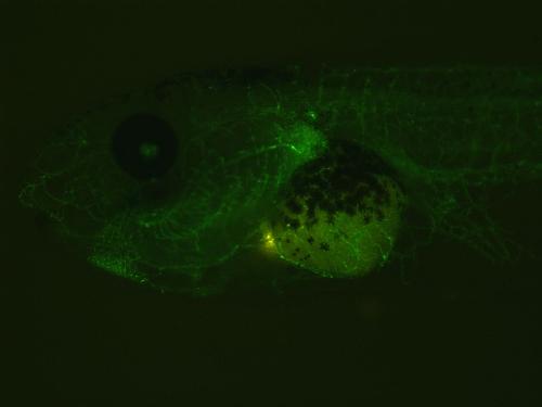 Endothelial lining of vasculature fluoresces blue-green in Xla.Tg(kdr:GFP)Mead tadpoles, especially bright in heart.