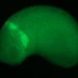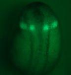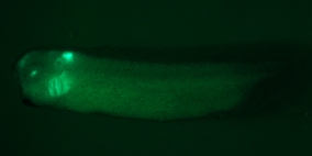 sox-GFP expression in migratory neural crest cells of the Xla.Tg(sox10:GFP)Jpsj, NF stage 26 tadpole.