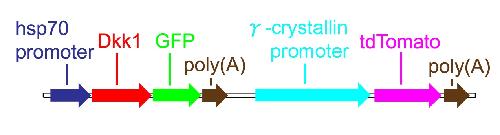 Map of the heat-shock-inducible Dkk1GFP transgene with lens labeling. The bright RFP variant, tdTomato under control of the 2.2-kb γ–crystallin promoter, was introduced downstream of hsp70-Dkk1GFP.